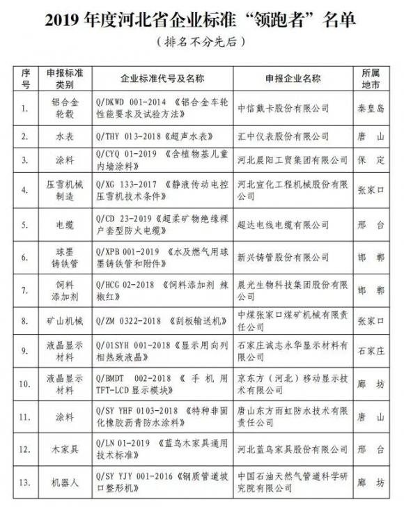 日前,河北省市場監督管理局發布《2019年度河北省企業標準“領跑者”名單》,晨……